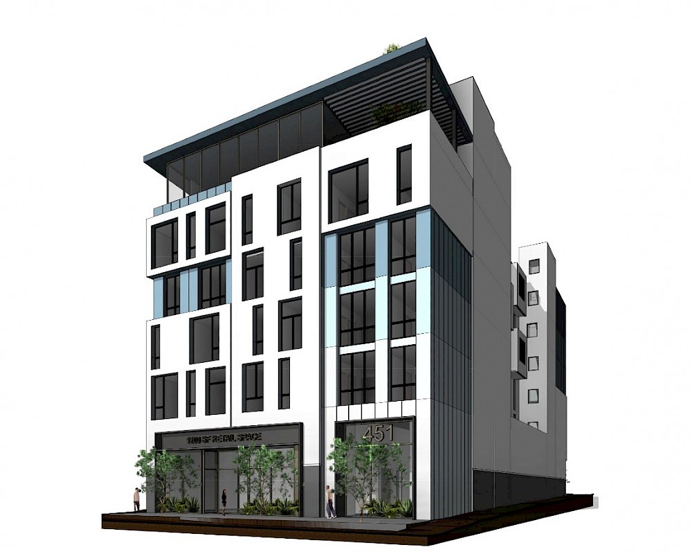 This multifamily project is located adjacent to the burgeoning Uptown district in Oakland. Using the State Density Bonus and Oakland’s local bonus program, we have increased the project density from 44 units to 53 units, taking advantage of the through lot condition and lateral views from the side of the parcel. The building is 6 stories in height, with 5 levels of Type 3 wood construction over one tall level of Type 1 concrete construction. The project includes a ground floor retail space and parking with a car stacker system. A common clubhouse amenity is planned for the top floor, with substantial outdoor spaces and small moments such as work-from-home alcoves. The design concept imagines the building as a block of solid white mass that is carved away to reveal a panelize system below that ombre fades from lighter blue at the base to darker at the top, like the evening sky.