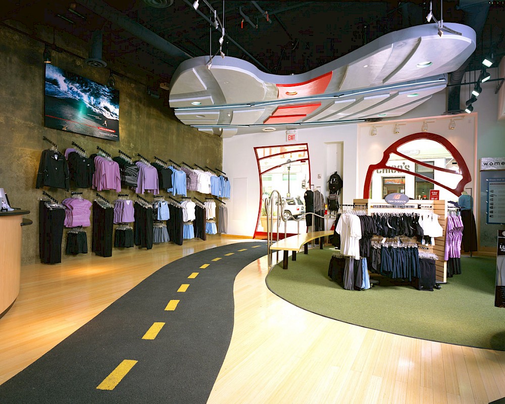 New Balance is a well-established brand in the shoe and athletic-wear industry, staking out a uniqi8ue place in the market with their domestic production, sustaining focus and emphasis on overall healthy lifestyle. For their retail outlet at Santana Row in San Jose, we worked with natural materials including cedar, organic forms and the iconography of the shoes themselves, including massive lacquered foam soles forming a playful dropped ceiling on the interior, projecting through to become an awning on the exterior.