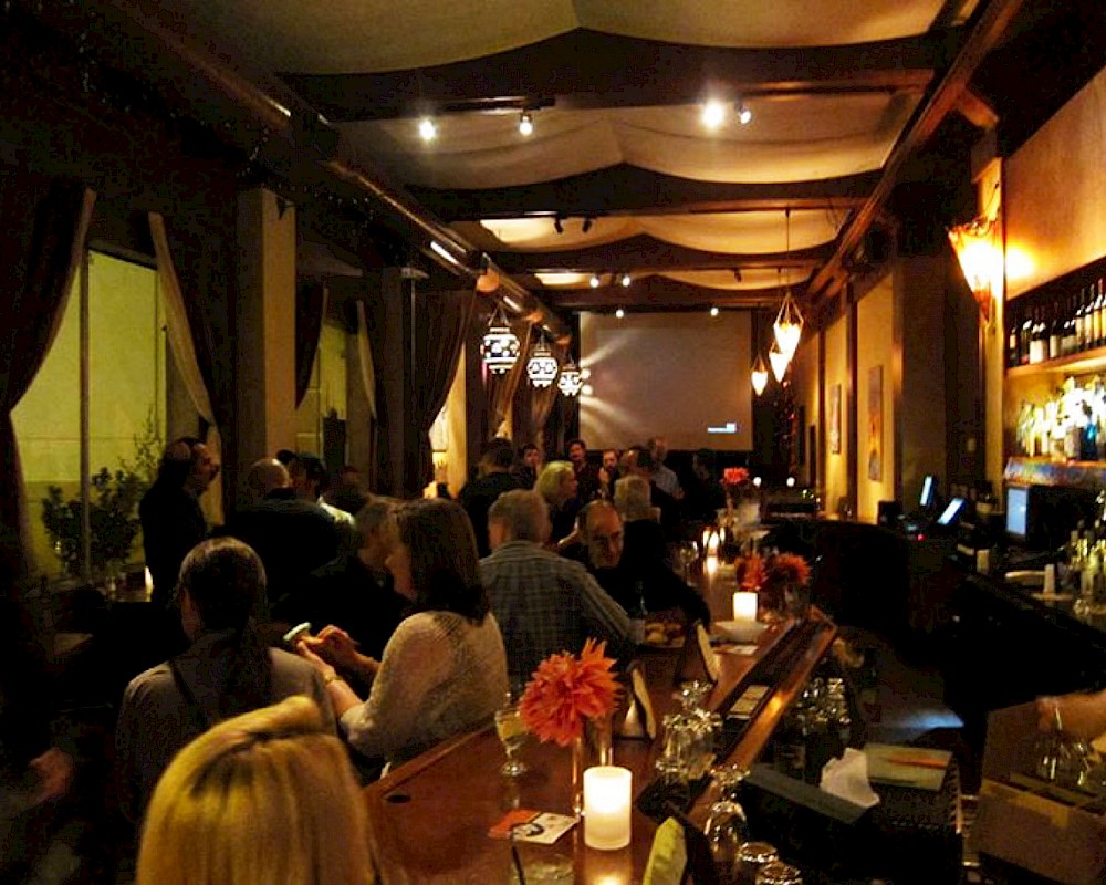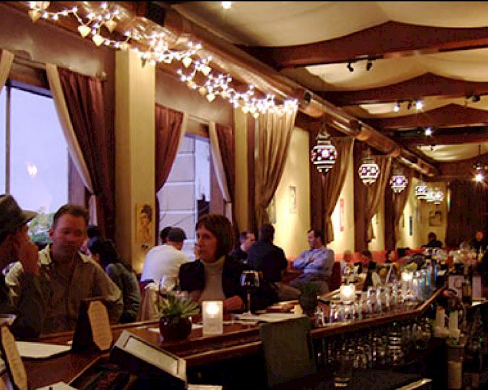 As is so often true with a restaurant venture, Soluna was opened by an energetic young chef on a hope, a prayer, and a few credit cards. Soluna is a café by morning, busy lunch time eatery by day, and wine bar and fine dining by night. The transformations are accomplished with elements such as variable lighting, projection screens, movable custom furnishings, and an integrated sound system. We created an environment of warm, rich, colors, drapery, a fabric paneled ceiling, and textured paints for a subtle Moroccan feel.