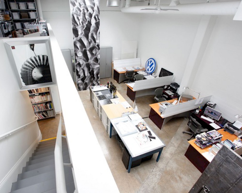 Mitchel Mauk is an award-winning exhibit designer, so it was an honor to be selected to work with him on the new offices for his firm. Located in a commercial warehouse space on the edge of the very hip Hayes Valley neighborhood of San Francisco, this bi-level facility plays with transparency and translucency. using contemporary materials such as Profilit glass channels, here held in place with repurposed skateboard wheels. Skylights flood light down through the space for a warm serene environment.