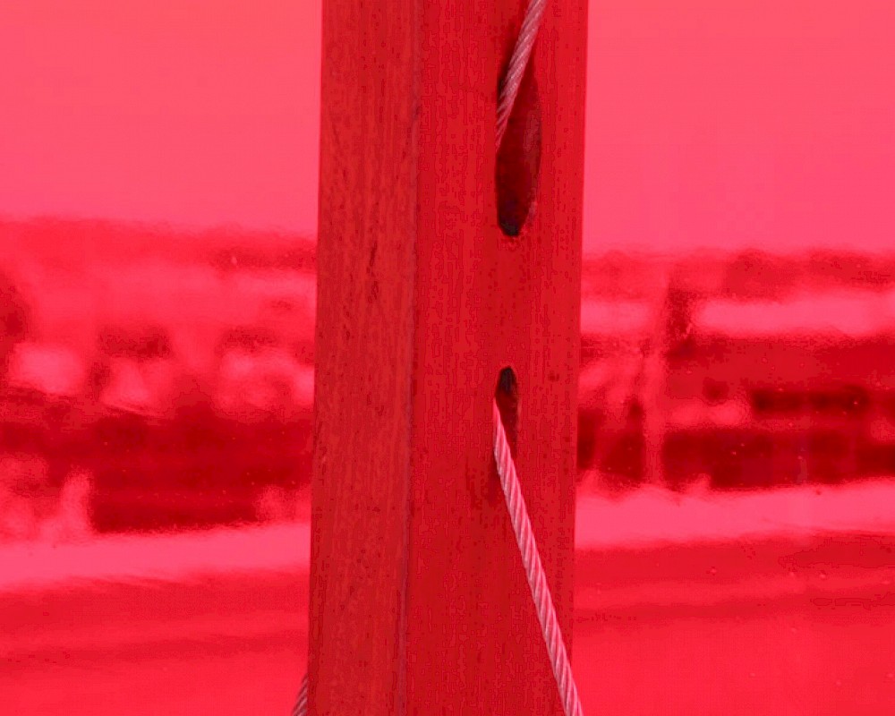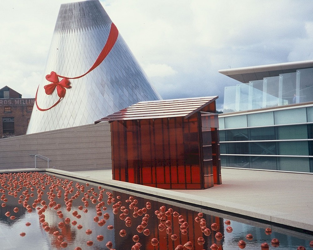 This house of red glass is an installation at Tacoma’s Museum of Glass. It is part of artist Mildred Howard’s series exploring the meaning of dwelling. Here a simple sharecropper’s shack is recast in vivid and luminous color. The theme is the fecundity and beauty of even the most modest house. The house itself is simply constructed. Lapped glass panels rest in custom metal clips. The wood frame is cross-rigged with cables to resist wind and the roof is raised to prevent uplift. Collaboration: Mildred Howard, artist.