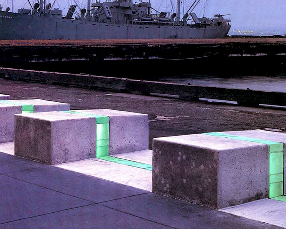 The illuminated glass block and white concrete ribbon runs for 2.5 miles along San Francisco’s waterfront, centered on the refurbished Ferry Building. The project’s concept was to demarcate the actual edge of San Francisco as it reaches its primary seawall and abuts the bay. Beyond the seawall the city stands on piers. The Art Ribbon traces the city’s real edge hidden below. The installation serves as a public amenity, integrating street furniture, sidewalk, and public art. Collaboration: Stanley Saitowitz and Vito Acconci.