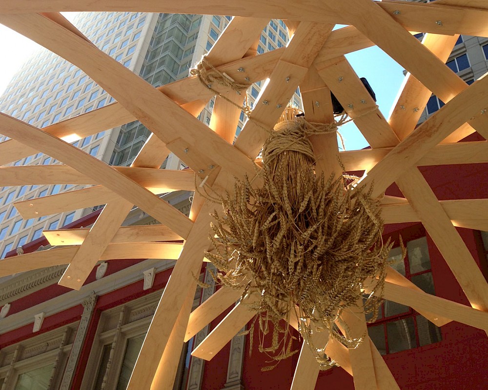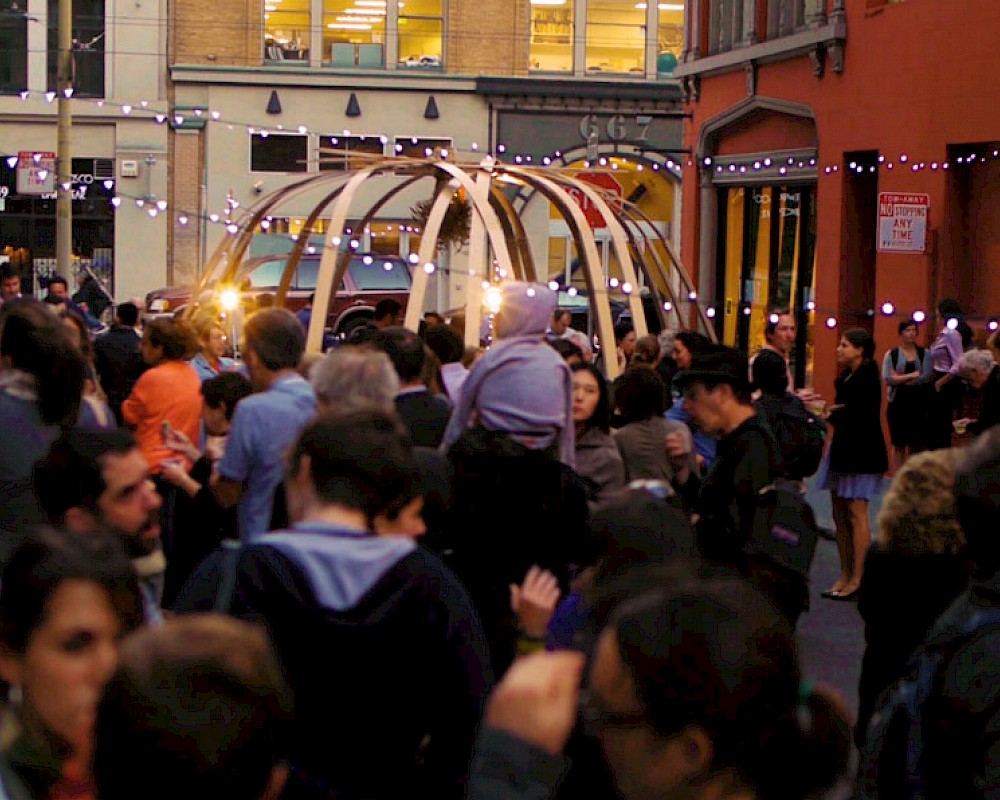 We were invited to design a Sukkah for the Jewish Community Center of San Francisco for their annual fall harvest Sukkot festival. This year, they partnered with the urban-planning think-tank SPUR to hold the festival in an alley downtown, turning the Sukkah into an urban happening and intervention. We designed and assisted in the building of the Sukkah. It is a series of wood slats fixed into a steel base, entirely demountable and flat-packed. Each assembly of the Sukkah can be customized by the team putting in together as an expression of community and adaptability. This is an open architecture.