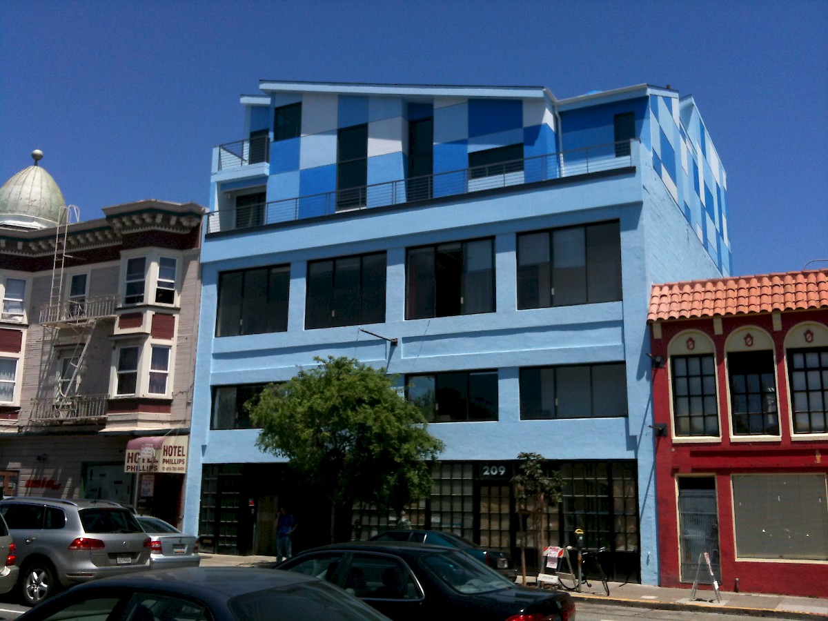 This work takes the “Percent for art” government grant in a new direction, fully integrating the art with the infrastructure. Three shades of blue and text from a commissioned poem are laminated into the glass walls of the bridge where Fillmore Street crosses Geary Blvd. It is a literal/ figurative bridge between the Western Addition and Japan Town and acts as a bus shelter, traffic noise mitigation, and windscreen. It is most beautiful when the low afternoon sun pours through it. Collaboration: Mildred Howard, artist.