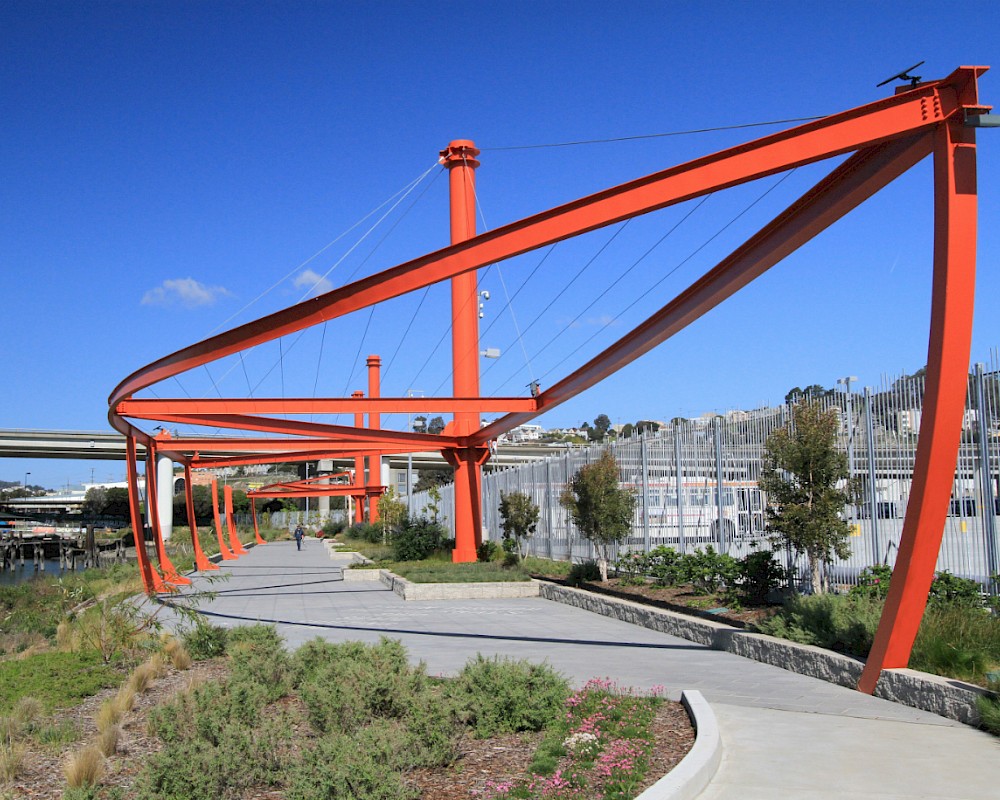Constructed in a new public park adjacent to Islais Creek, this massive art pieces calls in the ghosts of the Liberty Ships that once docked here. It is hard to imagine this sleepy creek leading out to the San Francisco Bay as a hub of industry and activity during the World Wars. At over 300' long and 50' tall, this sculpture takes on the scale of architecture. And, like architecture, it serve to make a space: a space for leisure and enjoyment but also for memory and contemplation. The steel beams are double-curved to precisely follow the profile and size of the hull of a Liberty Ship and painted International Orange to stand out against the sky. Collaboration: Nobuho Nagasawa.