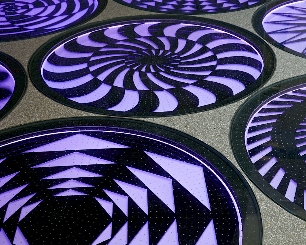 Produced in collaboration with the artist Eric Staller. Installed in a children's play area in the newly revamped Terminal 2 at SFO, this art piece is deceptively simple. As you walk up, your see static 60's psychedelic circular patterns embedded in the floor and wall. The piece senses your presence and they slowly start to spin. As you step on them, they change through a rainbow of different hues, appearing to turn each other like the gears of a giant absurd machine. Making such a simple thing is anything but simple. Textured 1-inch thick laminated glass covers allow us to walk across them and the entire floor of the airport had to be gently sloped upward to allow the hidden sensors and motors to lie below. Their minimalism is their magic.